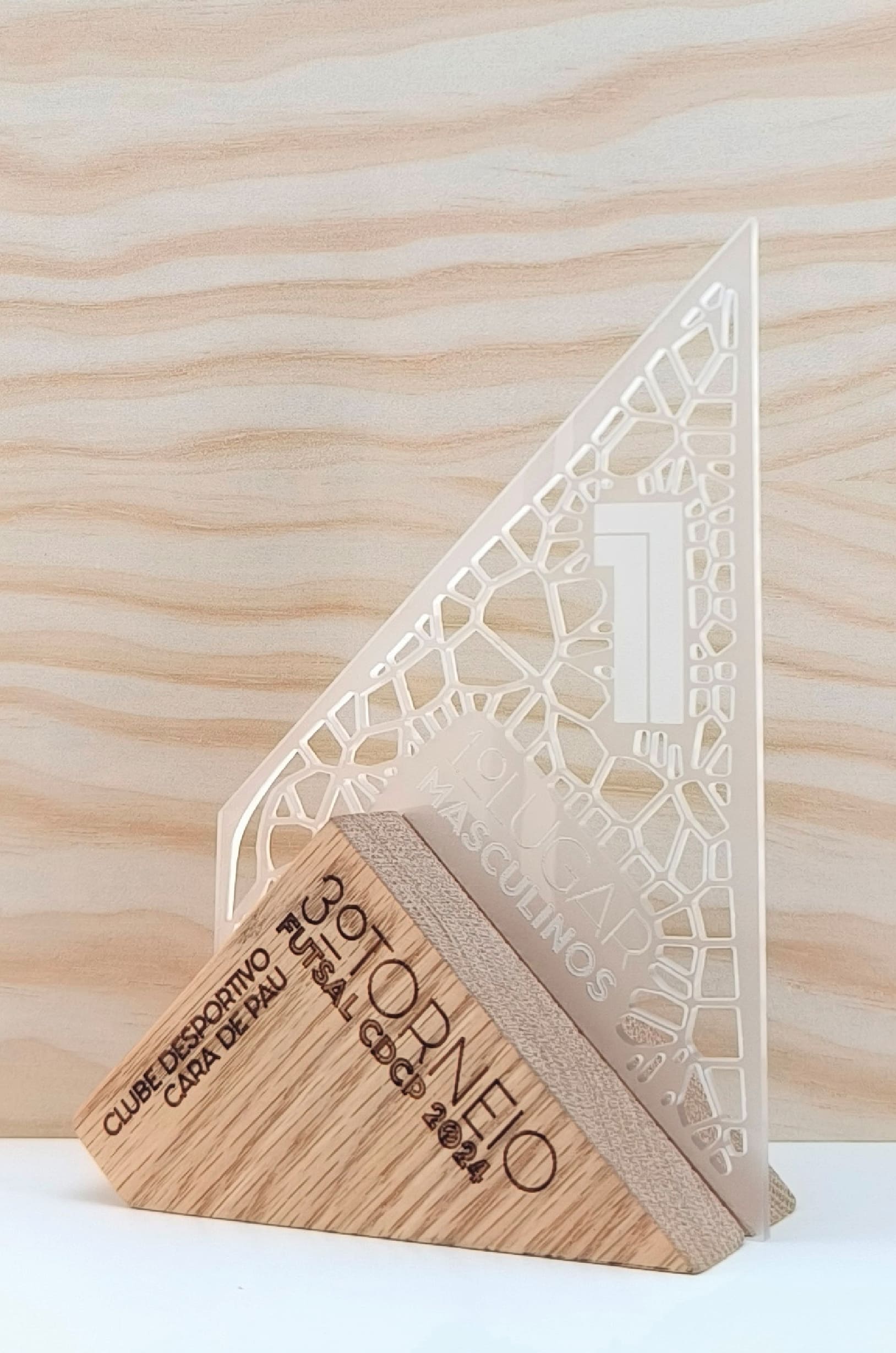 Troféu de base triangular em faia com centro em acrílico personalizado.