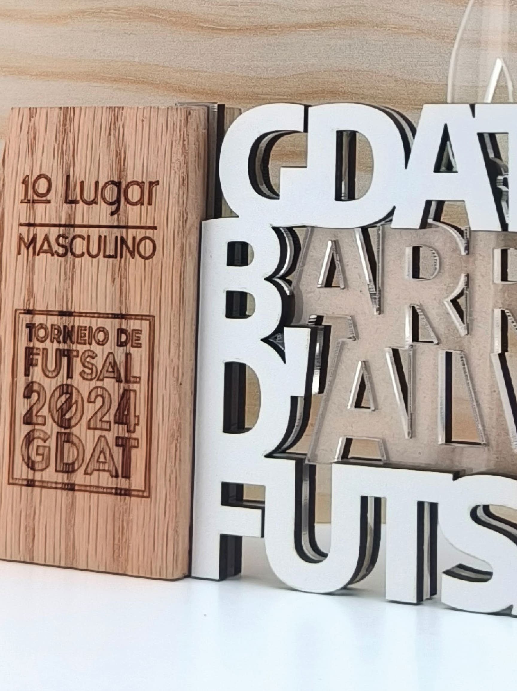Troféus exclusivos com design único para o seu evento. Lateral em madeira maciça de faia e letras em relevo com 3 camadas (acrílico e mdf).